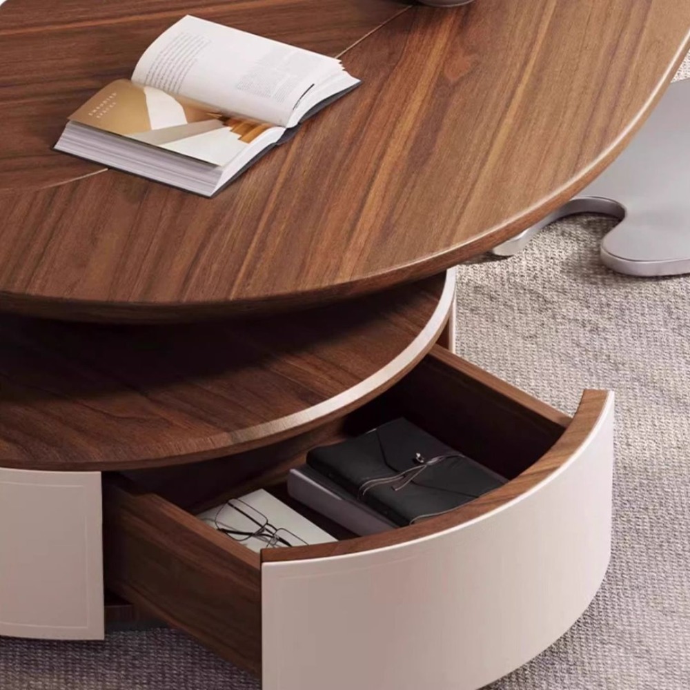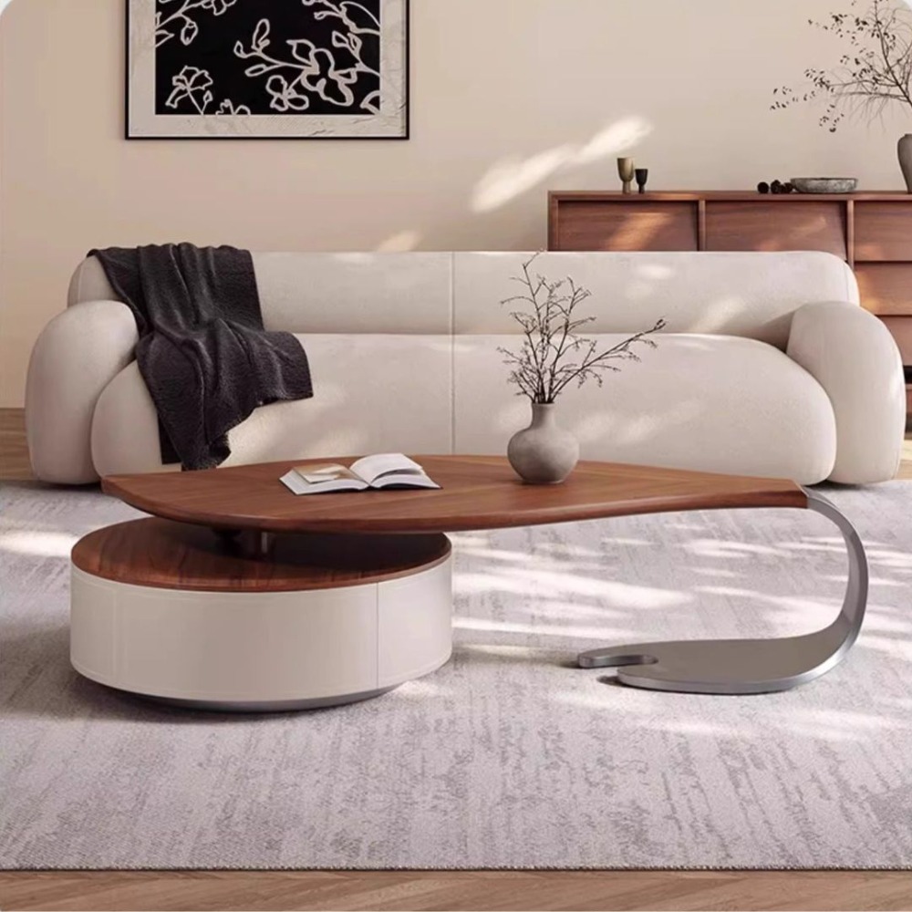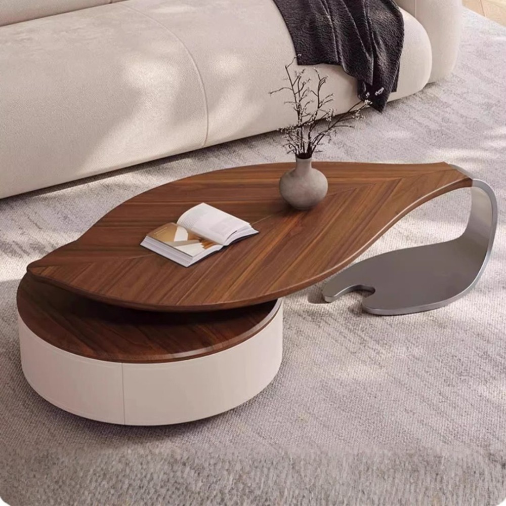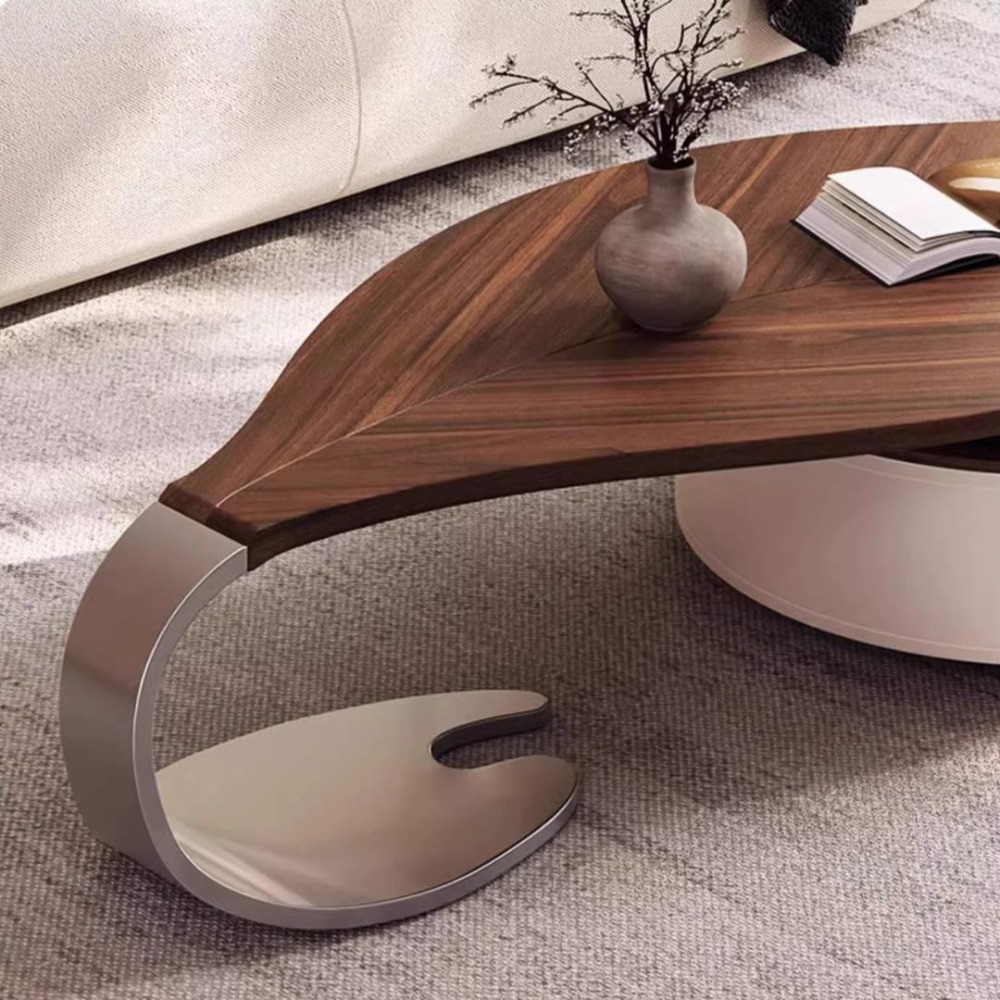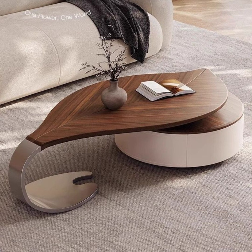 NICO|樹葉造型茶几 可伸縮設計擺放更靈活 大容量儲物抽屜滿足足夠的收納時刻保持客廳整潔 加厚馬鞍皮櫃體好保養易清潔 加厚不鏽鋼底座真空電鍍灰鈦經久耐用穩固承重