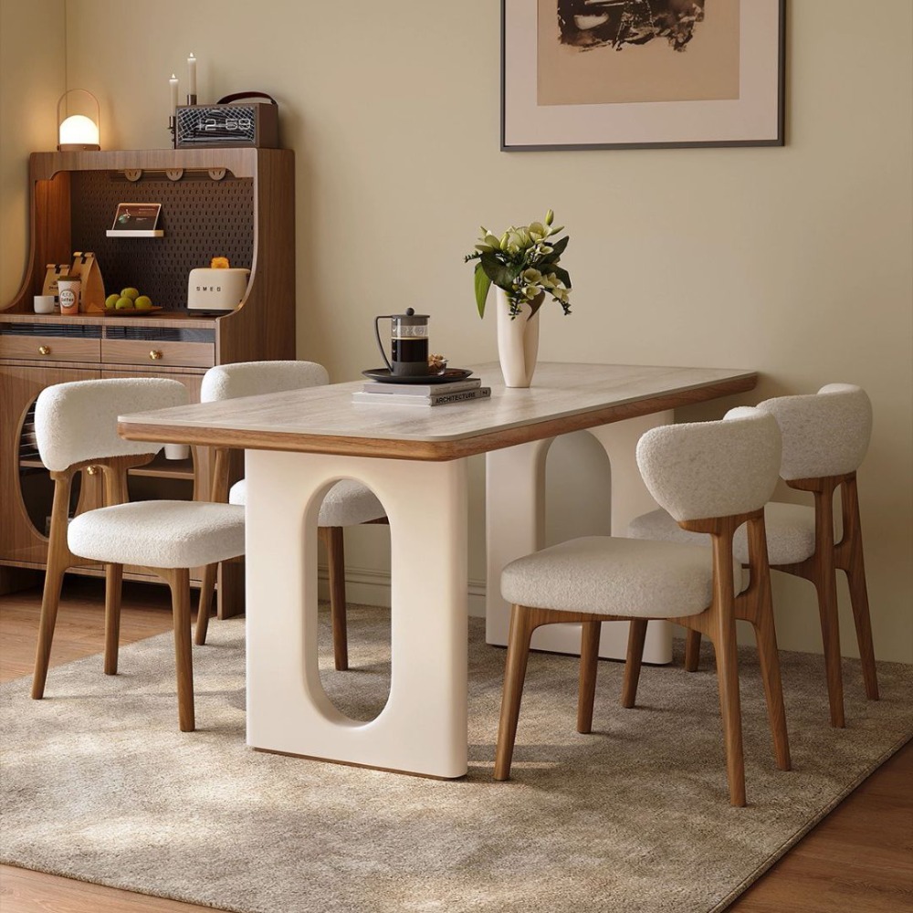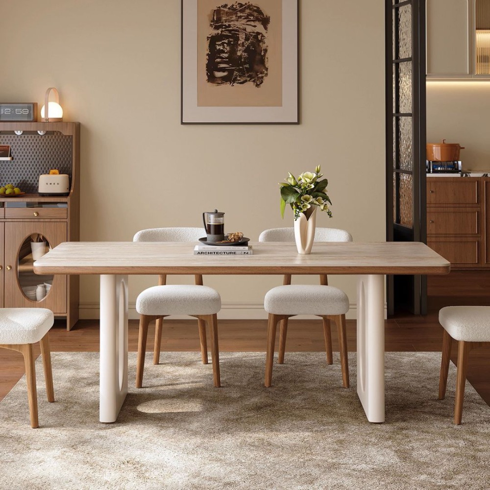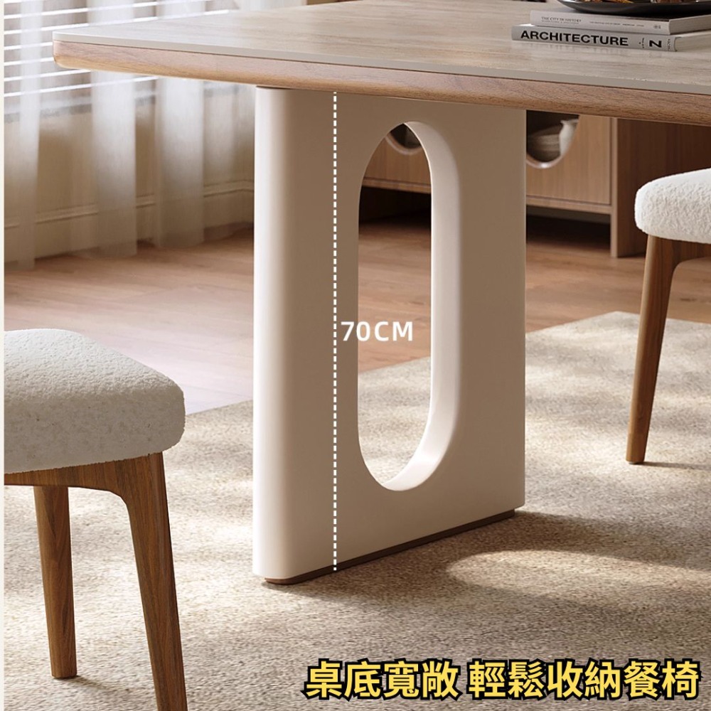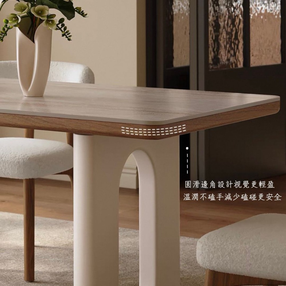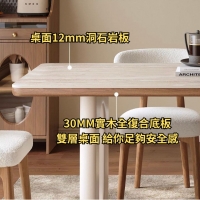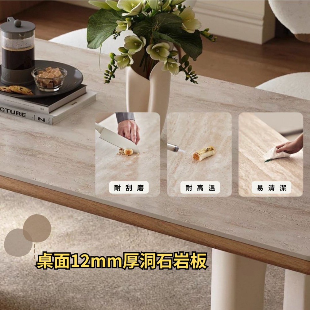 NICO|洞石岩板餐桌 | 12mm 厚耐刮、耐高溫、易清潔洞石岩板 | +30mm實木複合底板雙層桌面 | 雙重保護更承重更穩固給足安全感 | 獨特桌腳造型提升空間利用率餐椅輕鬆收納 | 圓角防磕碰安全設計 | 奶油風設計師餐桌 柔焦霧面質感打造浪漫用餐儀式感