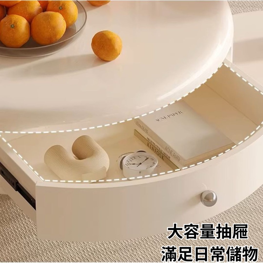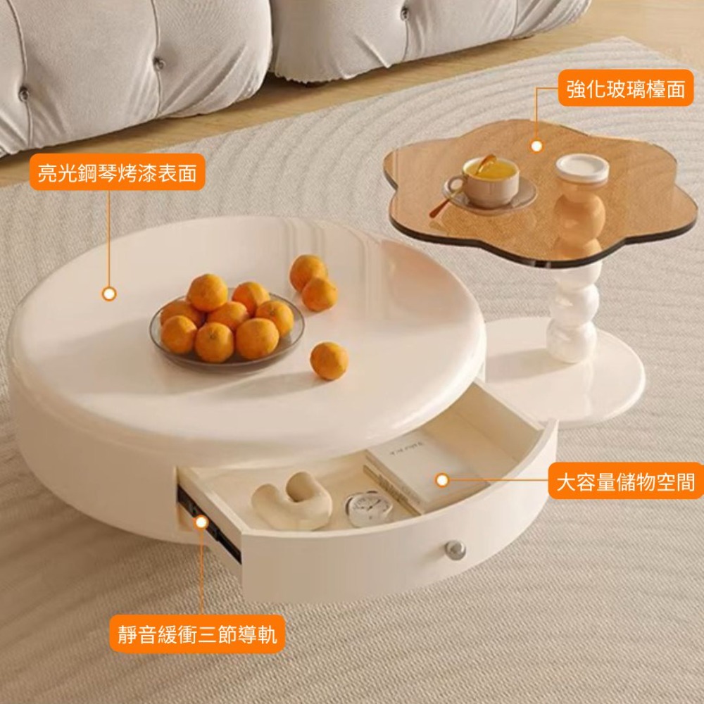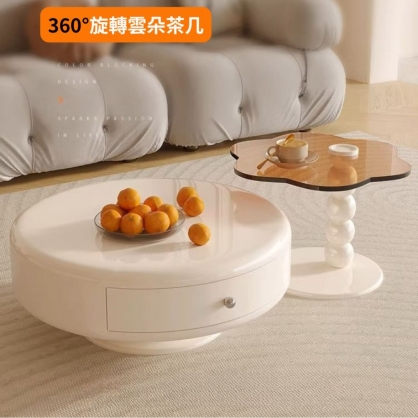NICO|還在尋找能讓家瞬間變高級的茶几嗎?台南尼可家具為您呈現「法式奶油風旋轉雲朵茶几組合」。這不只是一張桌子,更是客廳的靈魂。360° 靈活旋轉收納: 獨家旋轉大抽屜設計,搭配靜音緩衝三節導軌,順滑無聲,輕鬆收納客廳瑣碎小物,維持桌面整潔。