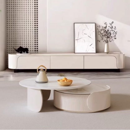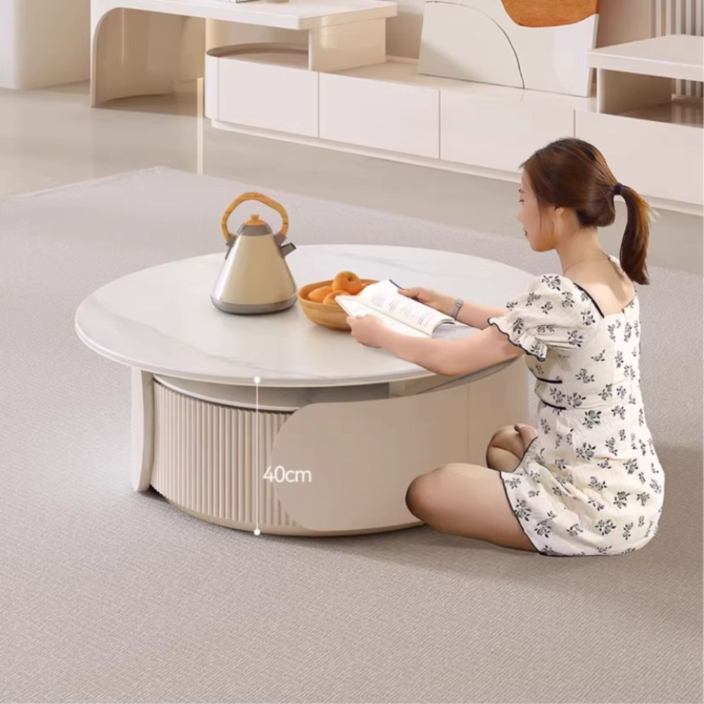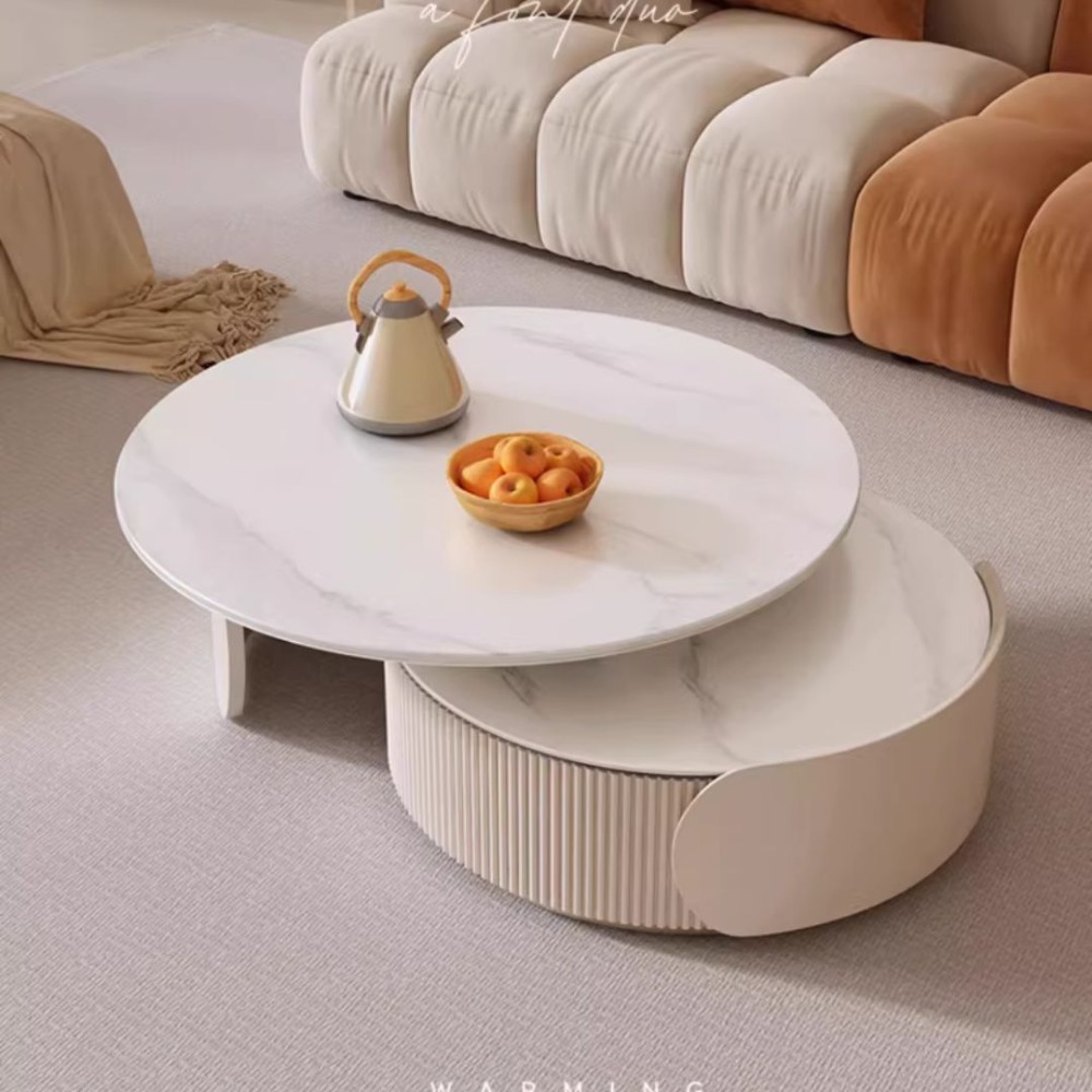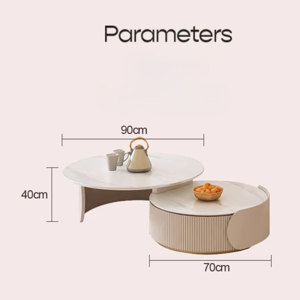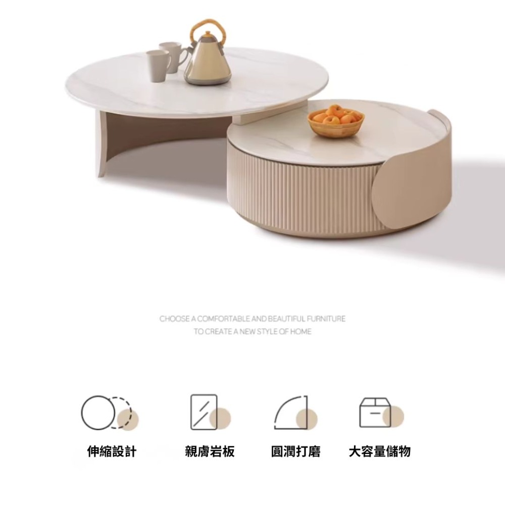NICO|專為小戶型設計的「子母圓茶几」,採用耐磨親膚岩板與實木多層板。90cm與70cm大小組合,空間運用更彈性。圓潤打磨邊緣,守護家人安全,告別磕碰。大容量抽屜收納,保持客廳整潔。台南尼可家具品質保證,多間門市歡迎預約參觀。