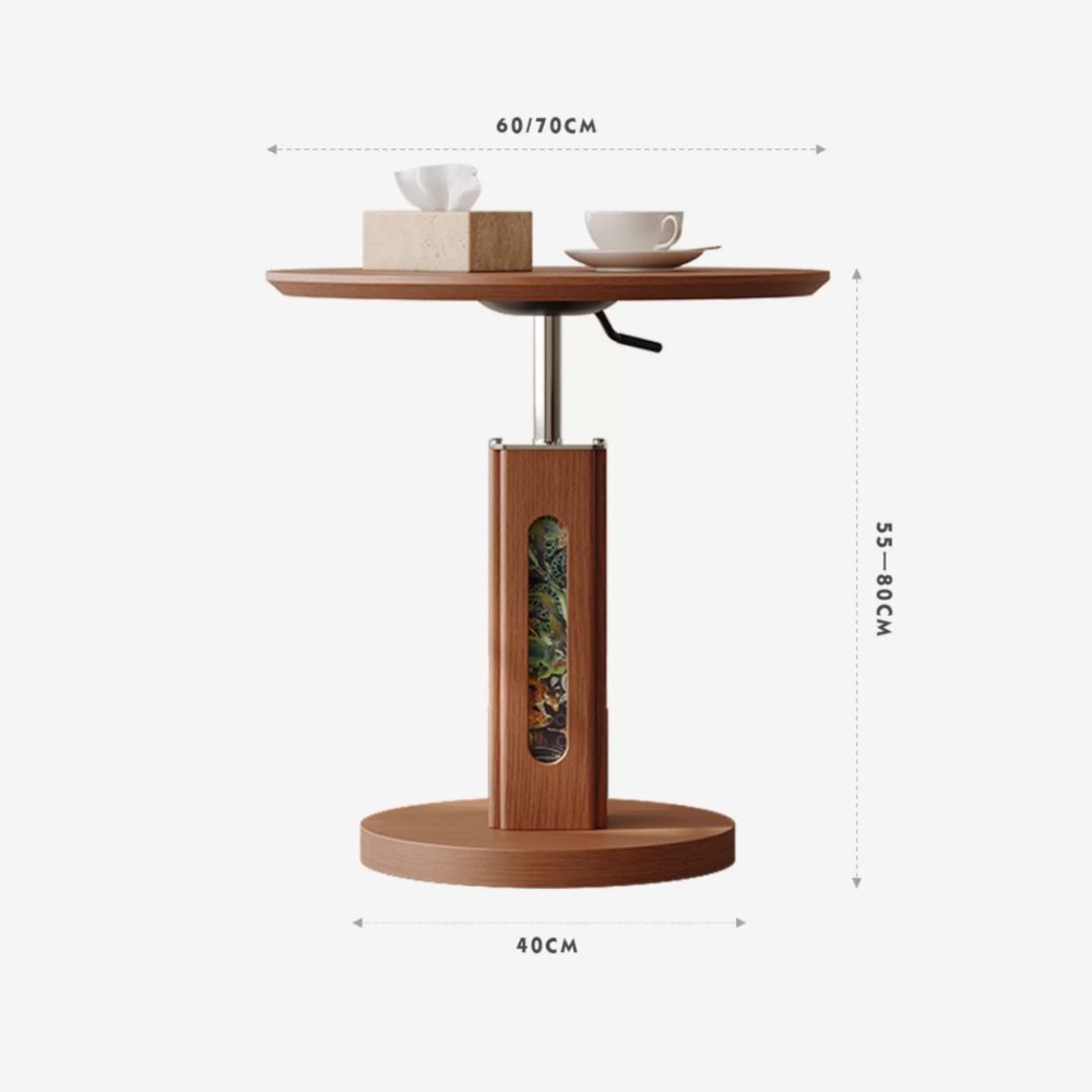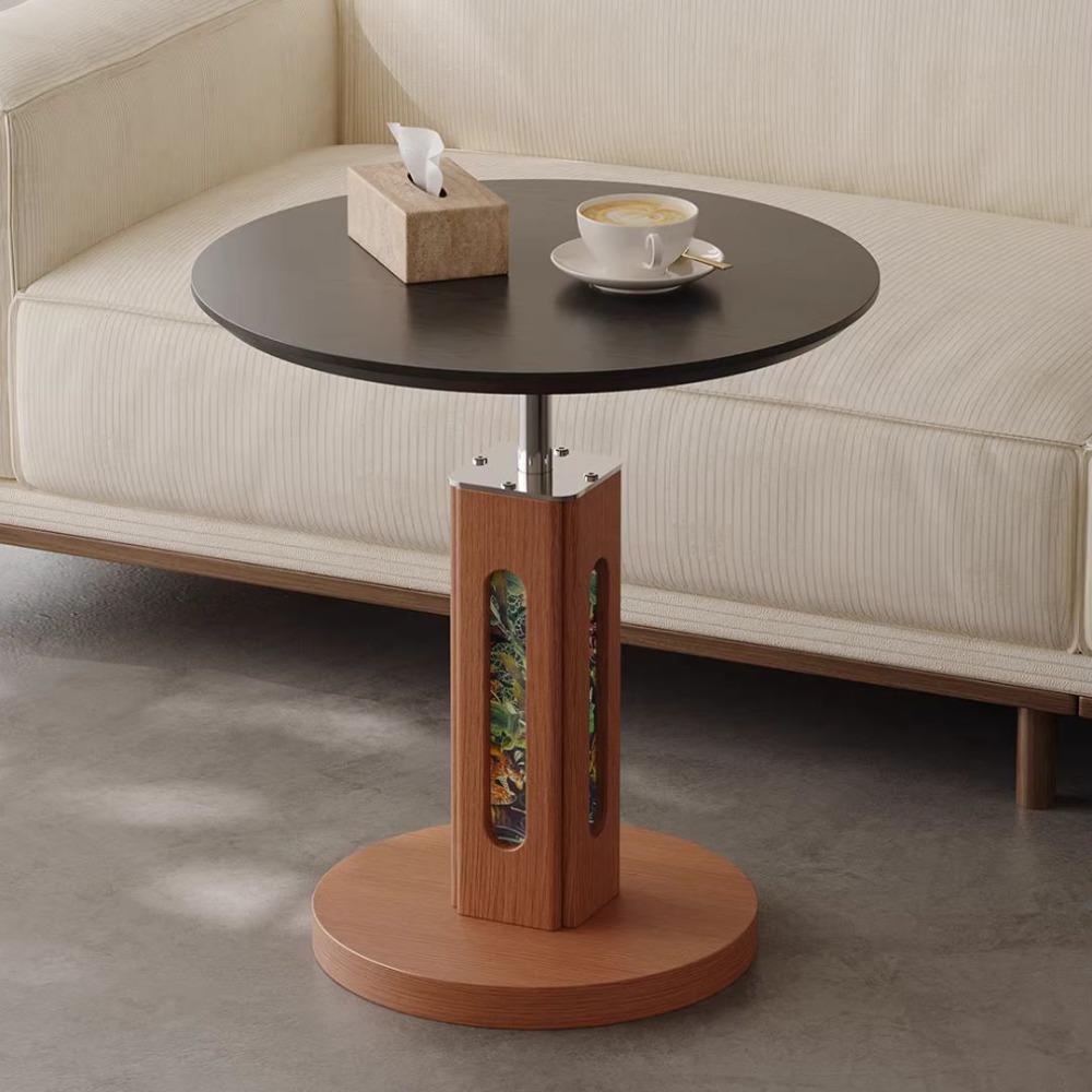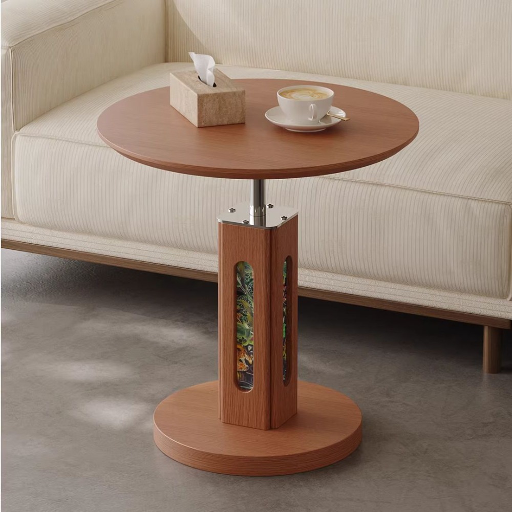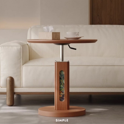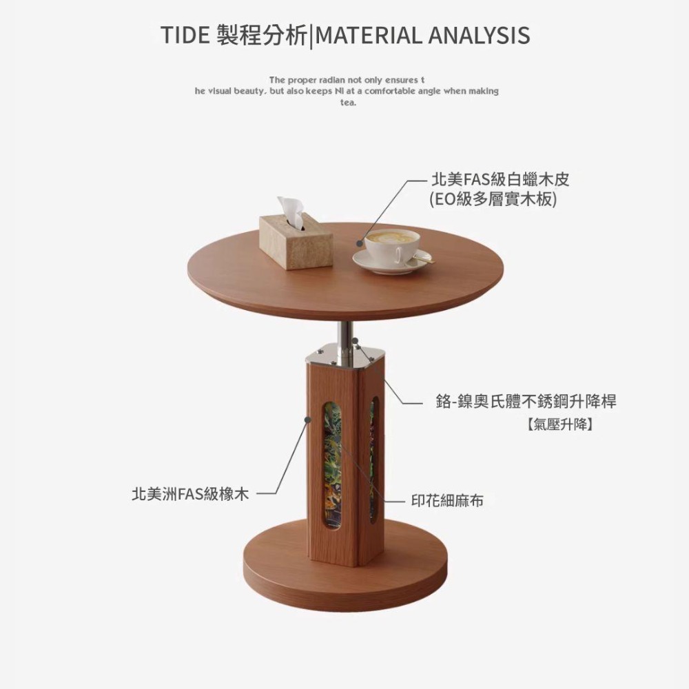 NICO|讓客廳成為藝術展間。採用北美FAS級白蠟木皮與氣壓升降技術,高度可在 55-80CM 間隨心調節。獨家印花細麻布支柱設計,展現層次豐富的中古風美學。耐高溫、防刮磨,穩固不搖晃。適用於小戶型客廳、沙發側、床邊桌。