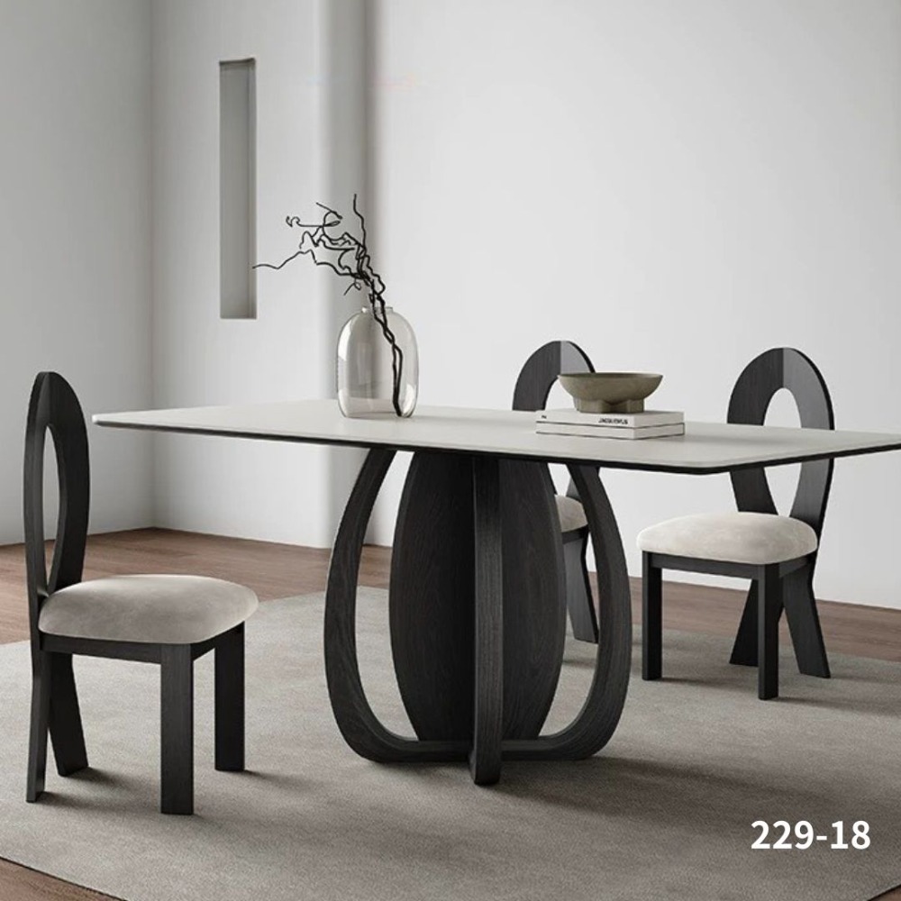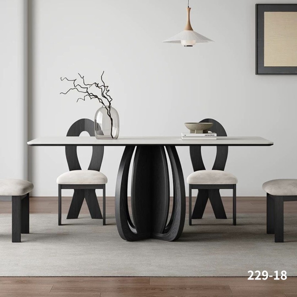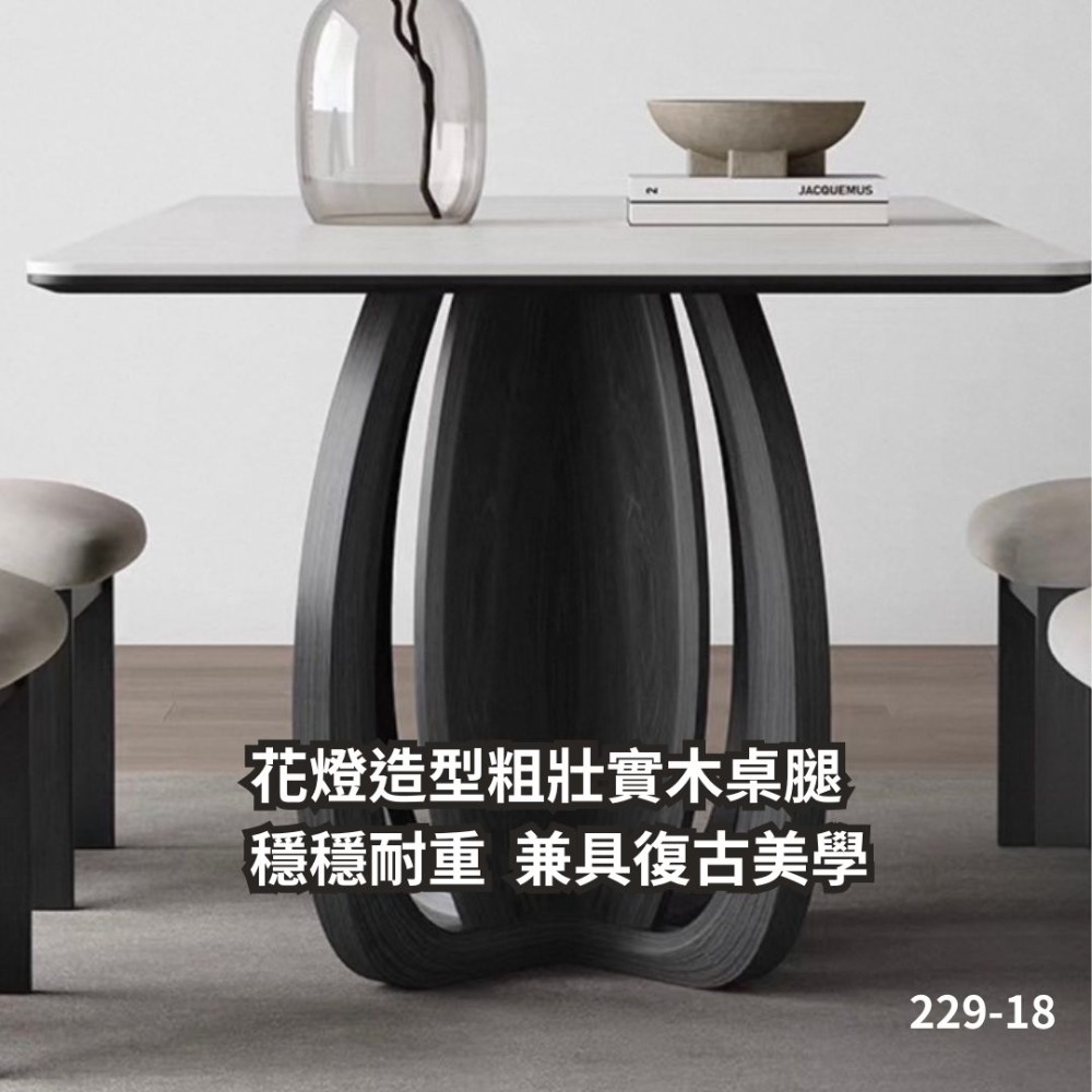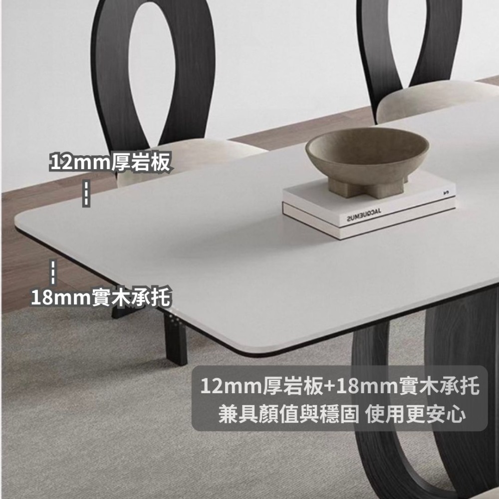 NICO|現代輕奢岩板餐桌|花燈造型粗壯黑色實木腳|我們採用 12mm 超厚岩板 疊加 18mm 實木承託底層。雙重加固不僅解決了岩板易碎的通病,更確保了整體的抗衝擊力與靜音效果。具備 耐高溫、防刮磨、不滲透 三大特性。熱鍋可直接放置,孩子在上面畫畫或鋼刷清理也不留痕跡。